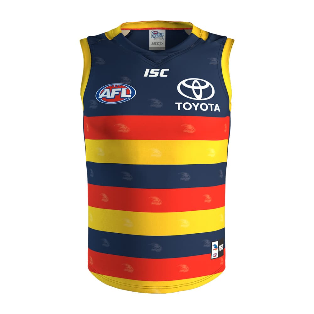 Support your team with the new designed Adelaide Crows Home Guernsey. It's the traditional guernsey we know and love with an exciting new twist. The guernsey features the club logo appearing on the left chest and the AFL logo is on the right side. The club's sponsor logos have been sublimated for durability.