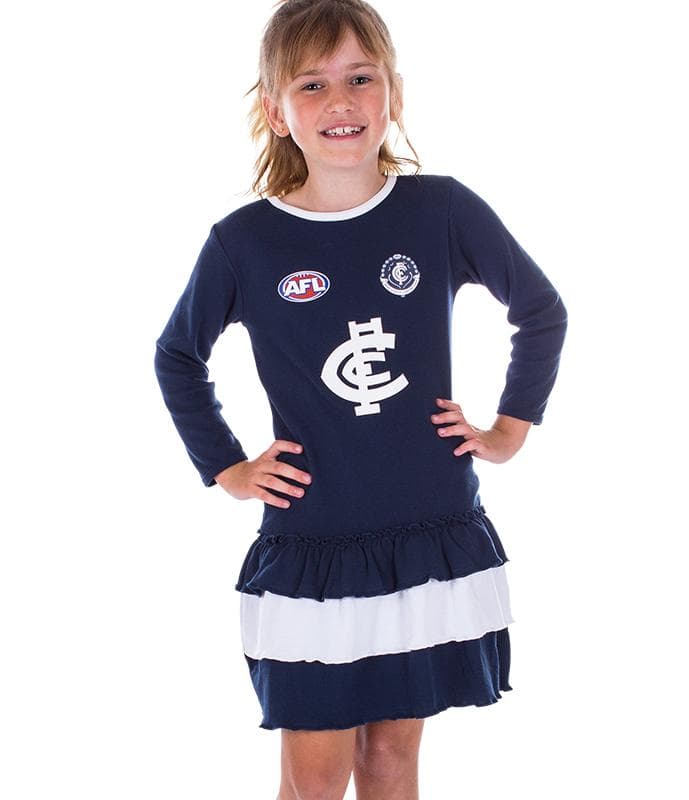 The AFL Girls Dress is an cute way that little girl fans can show their support for the Carlton Blues. The dress has been designed with long sleeves to ensure they are warm and comfortable. A three-layered frill finishes just above the knee, and there is a buttoned, teardrop opening at the back of the neck.
