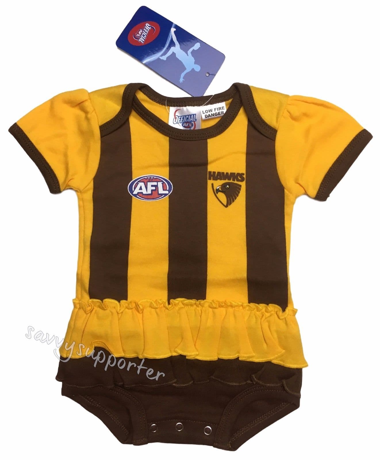 This product is part of the official Hawthorn Hawks merchandise range made on behalf of the AFL. A girls footysuit to suit the mini-cheerleader! Please check with size guide to help pick the best size.