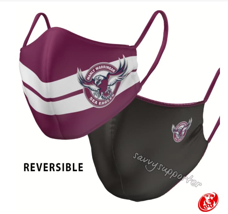 The 2021 NRL Face masks masks are double sided with the team colours on the front side, and a plain black with the primary logo on the reverse side.
