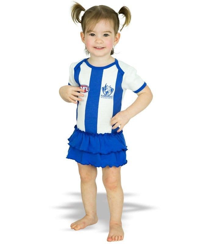 This product is part of the official North Melbourne Kangaroos merchandise range made on behalf of the AFL. A girls footysuit to suit the mini-cheerleader! Please check with size guide to help pick the best size.